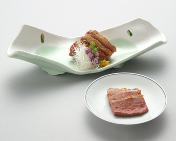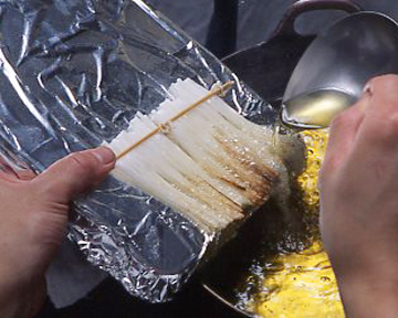 長芋はスライスして繊切りとし、湯にて霜降りしてぬめりを取ります。その後、アルミホイルを敷いた面器に長芋を並べ、色が付くまで200℃の油を掛けて油焼とし、秋らしく枯木の雰囲気を出しました。