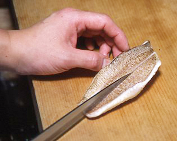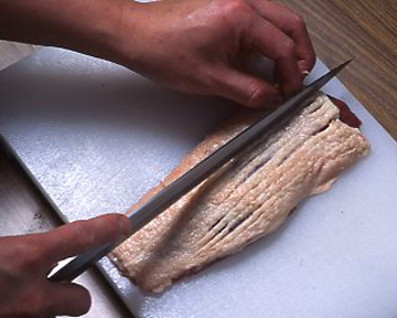皮面に庖丁を入れます。皮が固い場合などでも、歯切れ、身離れがよくなります。
