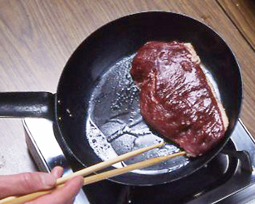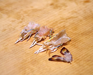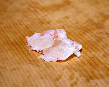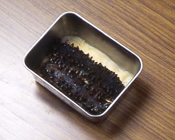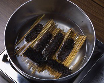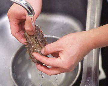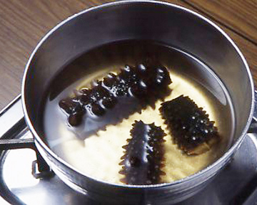もどしている途中で庖丁を入れて腹を割り、水で洗いながら中の腸の筋、汚れをきれいに取り除きます。この後、再度弱火でもどし、きれいな湯であおって、アクを獲って仕上げます。手荒に扱ったり、アクが強いと角(つの)が壊れます。
