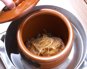 合鴨を焼いた時に出た脂でしんなりするくらい炒めた玉葱を壺に敷き、その上に合鴨をのせ、さらに上に玉葱をのせ、100℃に沸かした割汁を合鴨にひたひたくらいまで張ります。壺を湯煎にかけ、壺の中の汁を70℃に保って20分ほど火を入れて仕上げます。
