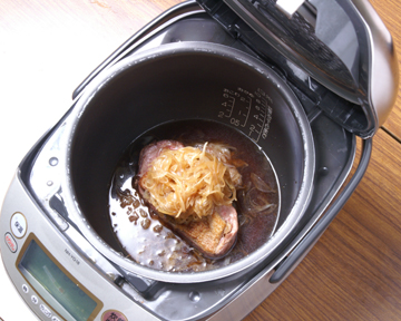 炊飯器を使って蒸します。割地を一度沸かして入れ、国産の真鴨の場合なら保温にして20〜25分で、ソフトできれいなピンク色に仕上がります。