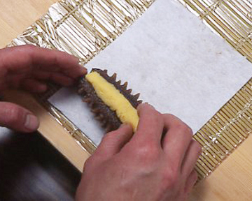 もどして粕漬にしたきんこにそれぞれ黄身寿し、芋寿しを鋳込んで、上がりに焼霜をして吉野酢を塗り、さらに焼いて酒粕の風味を出します。もどしたきんこは水分がでますので、鋳込んでから、リードを敷いた巻簾で丁寧に巻いて形を整えます。