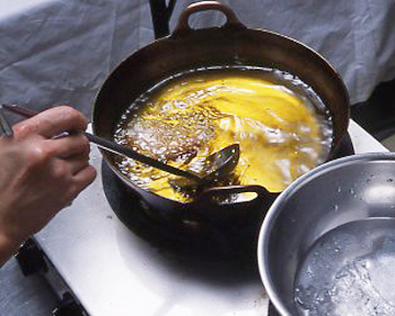 150℃くらいの油で、ゆっくり時間をかけて揚げます。