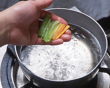 油を適量入れた湯でサッとあおって色出しします。水は沸騰しても100℃ですが、油を入れることでその温度が上がり、材料を入れても100℃以下に下がらず、旨みを閉じ込めて色よく仕上げることができます。